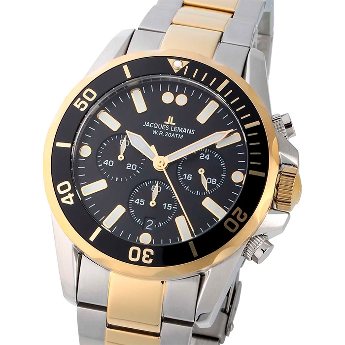 Jacques Lemans 1-2091I Liverpool er et 44 mm Forgyldt stål og stål herre ur med Forgyldt stål og stål rem, og Batteridrevet quartz urværk.