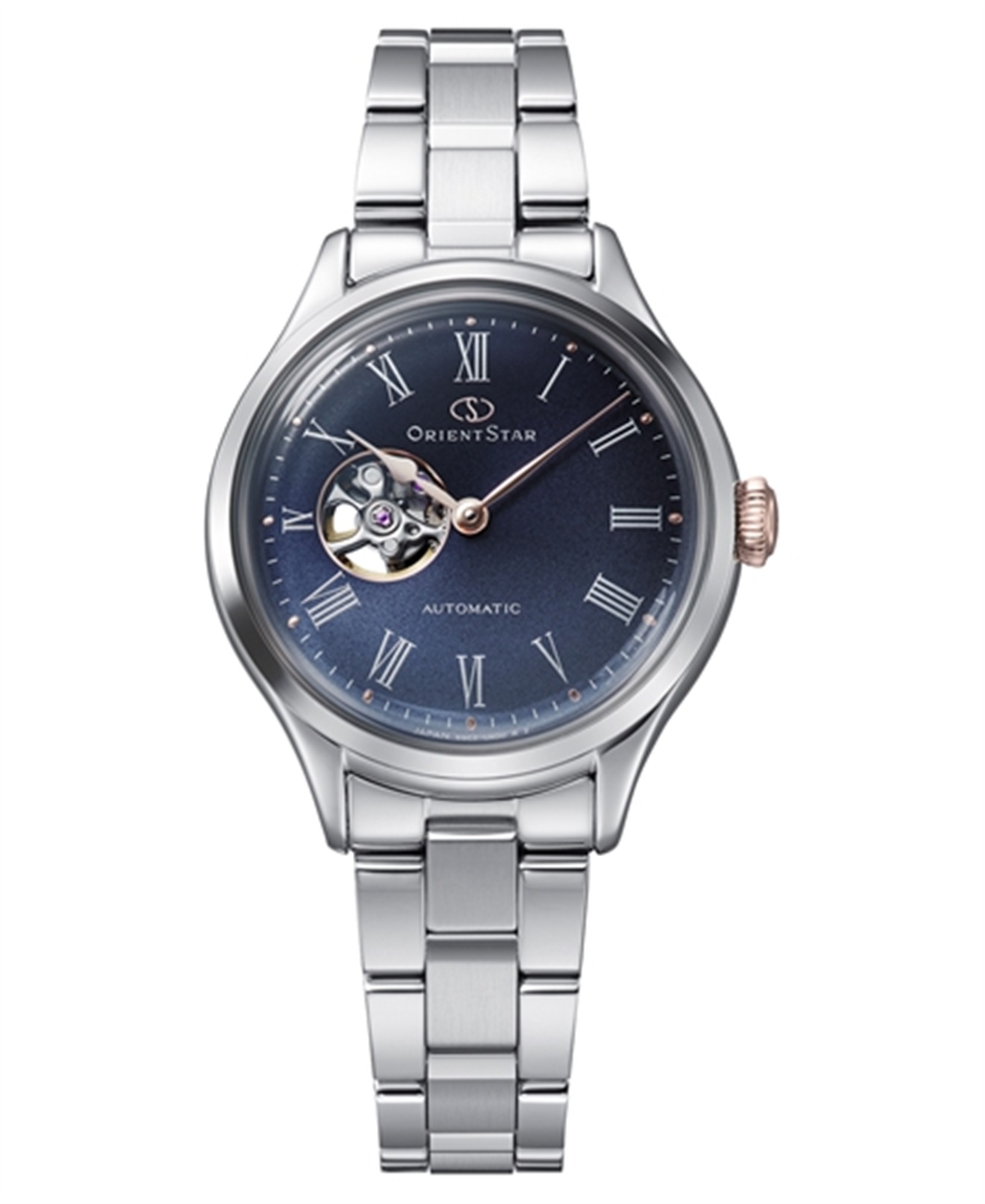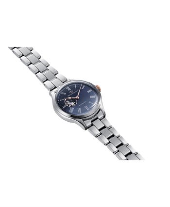 Mørk urskive med romertal, åbent hjerte-design, metalkæde. Orient Star Keshiki Limited Edition.