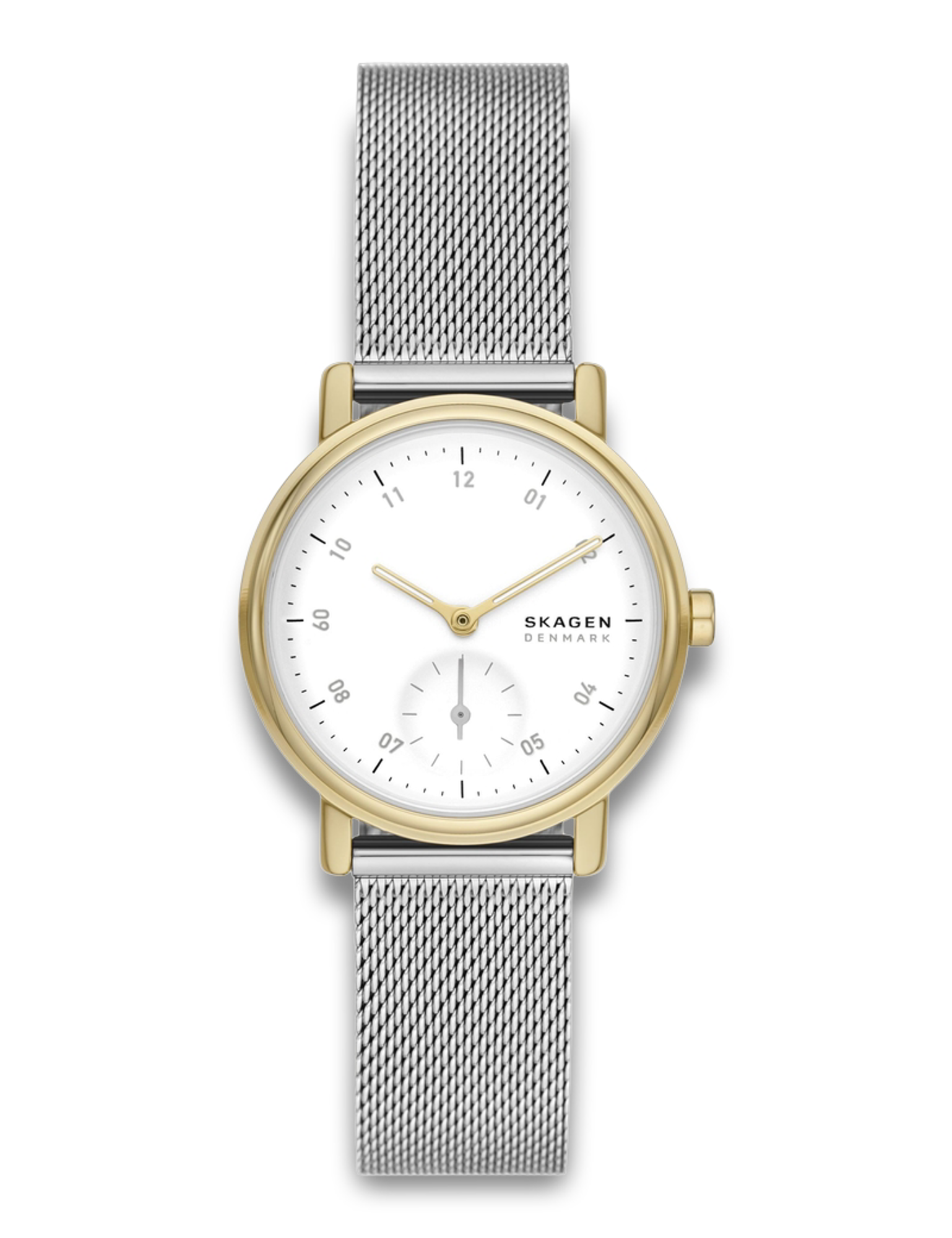 Dette Skagen-ur har en hvid urskive med tydelige markeringer og kombinerer guld og sølv i designet. Den slanke profil og det skandinaviske design gør uret anvendeligt til forskellige anledninger.