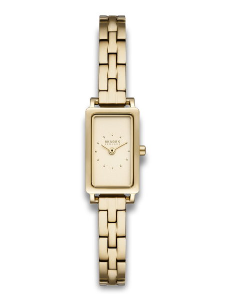 Dette Skagen-ur kombinerer en guldfarvet lænke med en lys urskive for nem aflæsning. Den rektangulære form og de diskrete timemarkeringer giver et rent udtryk, der er passende til både hverdag og særlige lejligheder.