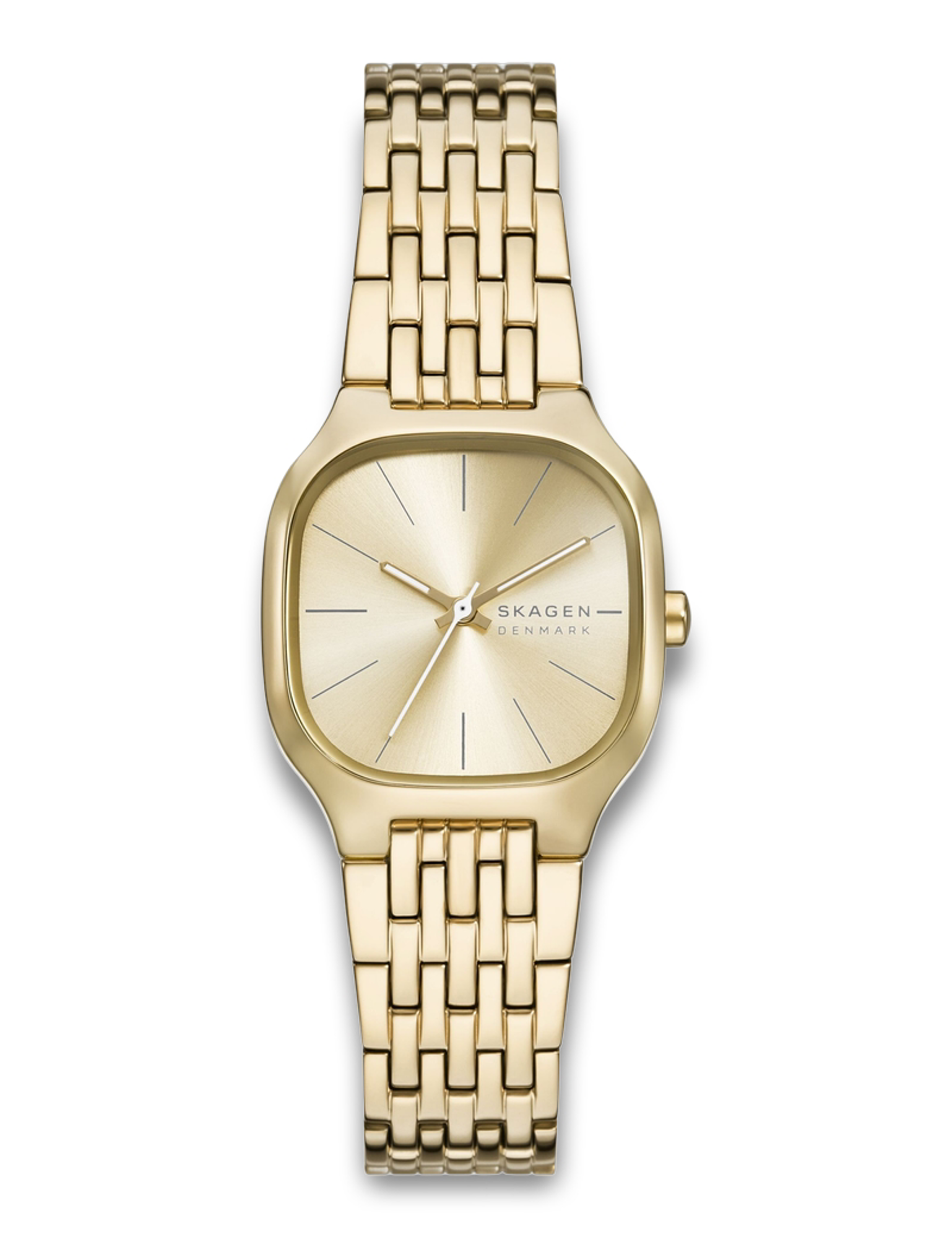 Dette Skagen-ur har et flettet lænkedesign med gylden finish. Lænkearmbåndet tilpasser sig håndleddet og giver uret et gennemført udtryk, der passer til forskellige anledninger.