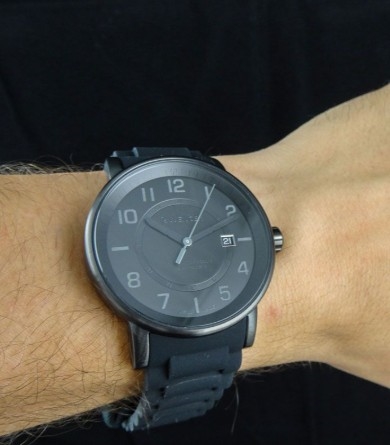 Design: Dette herreur har en robust og stilfuld design. Urets urkasse er lavet af rustfrit stål med en sort IP-belægning, der giver det en moderne og holdbar finish. Urets urskive har en sort baggrund med hvide timeindekser og markeringer.